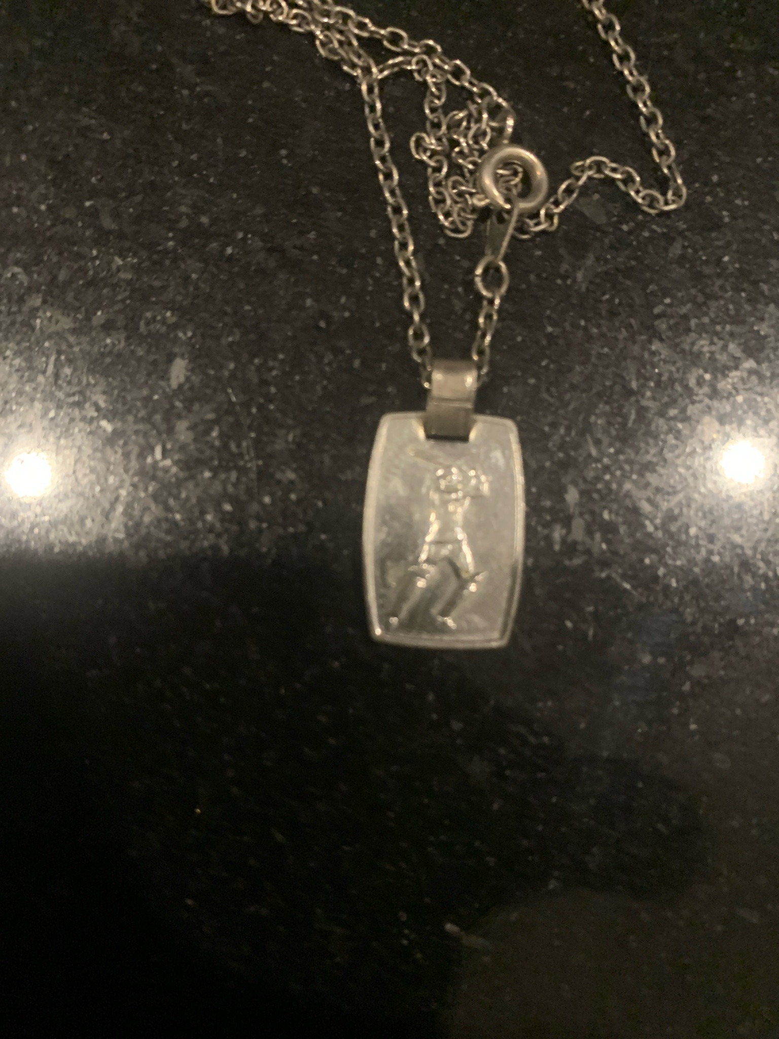 This item is a commemorative sports-themed pendant necklace featuring a bas-relief depiction of a baseball player in mid-swing. The pendant is rectangular with slightly bowed sides (tonneau shape) and includes a wide integral bail at the top. It is suspended from a delicate cable link chain, which is secured by a standard spring ring clasp. The material appears to be a silver-toned metal, likely sterling silver or silver-plated base metal, exhibiting a duller, matte patina across the recessed background of the image to provide contrast against the raised figure. The figure itself displays anatomical detail consistent with mid-to-late 20th-century jewelry design. Condition is fair to good, with visible surface micro-scratches and minor tarnishing throughout the pendant face and chain. There are no immediately visible maker's marks or hallmarks on the front side, though such identification is often found on the reverse or the clasp. The construction suggests a mass-produced commemorative piece rather than a bespoke artisan work, yet it retains clear detail in the athlete's pose and uniform.