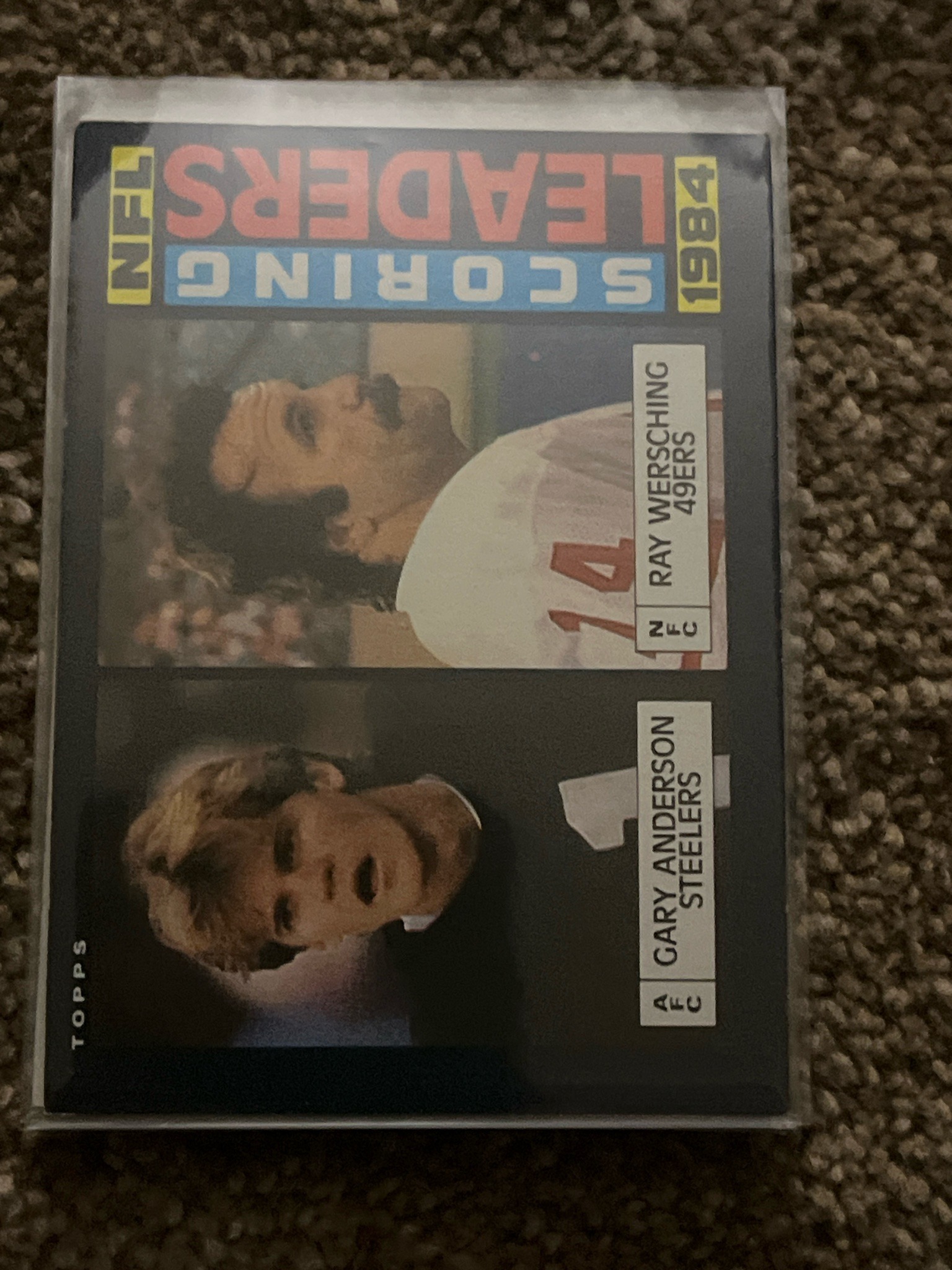 This is a 1985 Topps NFL football trading card featuring the 1984 Scoring Leaders, Ray Wersching of the San Francisco 49ers (NFC) and Gary Anderson of the Pittsburgh Steelers (AFC). The card features a vertical orientation when viewed correctly, with a dark blue or black background. The top header displays 'SCORING LEADERS' in large block letters with 'NFL' and '1984' flanking the sides in yellow boxes. The card is printed on standard mid-1980s cardboard stock. Physically, the card appears to be housed in a clear protective plastic sleeve or penny sleeve. The centering of the image appears slightly off-center toward the bottom or side, which is common for this era of Topps production. The corners show some signs of softening, particularly the bottom left, though most edges remain relatively sharp. The surface maintains a semi-gloss finish characteristic of Topps cards from the mid-80s. No major creases, moisture damage, or significant surface scuffs are immediately visible through the protective sleeve. This specific card represents a statistics leader subset, which is a popular thematic element in vintage sports card collecting. The printing uses a CMYK process, visible in the grain of the player photographs. Topps manufacturing marks are visible along the side edge.