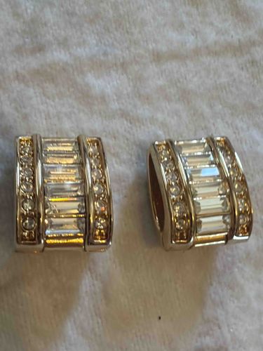 This pair of earrings features a wide, curved J-hoop or 'huggie' style design, constructed from a polished yellow gold-tone metal. Each earring is embellished with three distinct rows of faceted clear stones, likely cubic zirconia or high-quality glass crystals. The central row consists of horizontally stacked baguette-cut stones, securely held within a channel setting. This central section is flanked on both sides by a vertical row of round-cut stones in pavé or grain settings. The architectural aesthetic is characteristic of late 20th-century costume jewelry, specifically the 1980s to early 1990s, mimicking high-end 'fine jewelry' designs from houses like Cartier or Bulgari. The construction appears sturdy, with the channel walls providing a clean, geometric border to the baguette stones. Condition-wise, the gold plating shows light surface scratches and minor dulling consistent with gentle wear, though no significant plating loss or 'greening' is visible in the photograph. All stones appear to be intact with no obvious chips or replacements. While no maker's mark is visible from this angle, the clean execution of the settings suggests a mid-to-high tier costume jewelry manufacturer. The earring backs are likely clip-on or post-and-omega clasp given the width of the band.