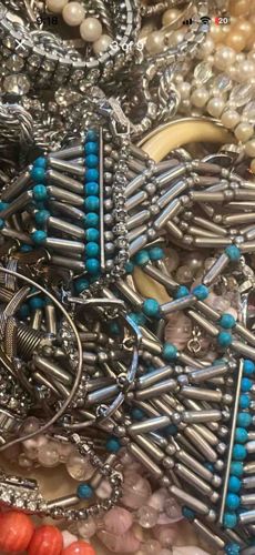 This item is a multi-strand vintage bracelet featuring a mix of Southwestern and Mid-Century costume jewelry design elements. The primary construction consists of horizontal rows of fine, tube-shaped 'liquid silver' (heishi-style) beads, which are likely silver-plated or nickel-based given the bright, reflective sheen. Interspersed throughout the metallic beads are small, spherical beads in a vibrant turquoise blue color, possibly genuine turquoise or dyed stabilizers. The beads are arranged in stacked, parallel sections divided by vertical metal spacer bars, creating a wide, cuff-like appearance. Surrounding this central piece are other items including rhinestone-set necklaces, faux pearls, and coral-colored beads, suggesting this is part of a bulk estate collection. The bracelet shows some signs of surface oxidation and tangling within the liquid silver strands, typical of mid-to-late 20th-century costume jewelry. The construction indicates a mass-market production style commonly sold in the 1970s and 80s as souvenir or department store jewelry. No specific maker's marks are visible in the tangled heap, but the craftsmanship is consistent with standard assembly techniques of the period.