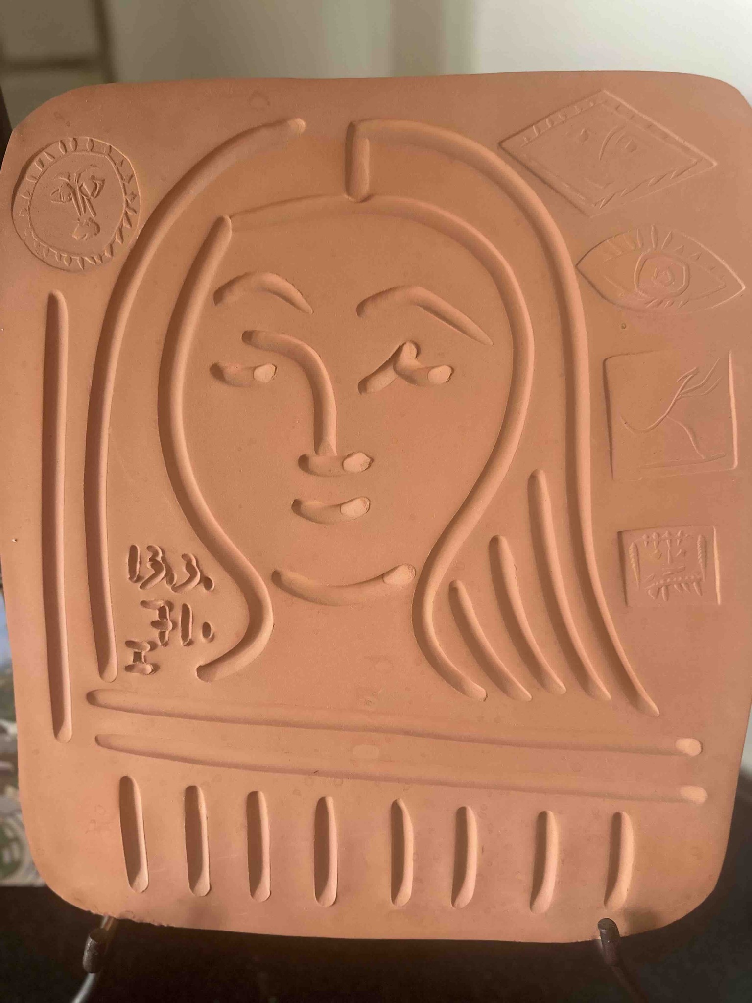 This item is a square-shaped red earthenware plaque from the Madoura workshop in Vallauris, France, featuring a relief design by Pablo Picasso. The central motif depicts a stylized female face with flowing hair, rendered in raised, linear terracotta. The plaque is unglazed, showcasing the natural light-terracotta or reddish-orange clay body. Surrounding the central face are several symbolic stamps or 'marques d'atelier' commonly found in Picasso's ceramic oeuvre, including an eye, a sun-like circle, and geometric motifs. To the lower left of the face, there is a handwritten date inscription in the clay, '13.3.71', indicating it was designed or conceived on March 13, 1971. The bottom of the plaque features a series of vertical incised lines reminiscent of a comb or fringe. The craftsmanship utilizes the 'empreinte originale' (original print) technique, where a mold created by Picasso was used to press the design into the wet clay. The condition appears excellent with no visible cracks, chips, or major abrasions, though some natural variations in the clay color and minor surface dust are present. The edges are softly rounded, and the overall construction is thick and substantial, typical of the late-period collaborations between Picasso and the Ramié family at Madoura.