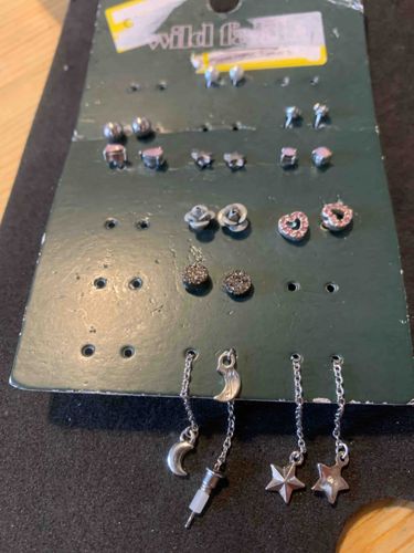 This is a collection of assorted fashion jewelry earrings displayed on a dark green branded card from the 'Wild Fable' line. The set includes multiple pairs of stud earrings and two pairs of drop/dangle earrings. The materials appear to be base metal with silver-tone finishing, likely incorporating zinc alloy or brass with glass or plastic 'gemstone' accents. Specific designs include small metallic spheres, pink heart-shaped studs with micro-crystals, small pink square studs, metallic roses, and textured dark circular studs. The dangle earrings feature thin cable chains with celestial charms: one pair features crescent moons, and the other features five-pointed stars. The construction is mass-produced, typical of fast-fashion retail. Condition-wise, the set is incomplete with several vacant holes on the backing card. There is visible wear on the card including creases, a torn price tag/label at the top with yellow residue, and scuffing along the edges. The jewelry itself shows some dulling of the metallic finish, suggesting light use or exposure to air. This set represents contemporary mass-market jewelry produced in the last 5-10 years, focuses on trend-driven aesthetics rather than high-end material value.