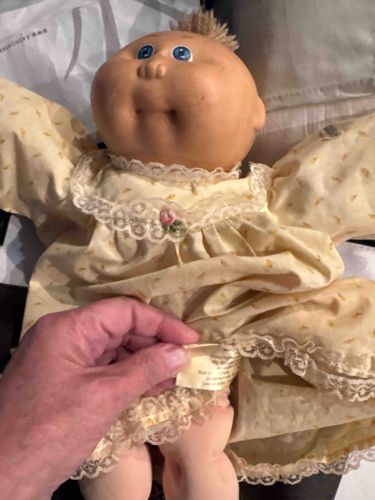 This is a vintage Cabbage Patch Kids doll, likely dating from the mid-1980s. The doll features the signature molded vinyl head with a soft cloth body, which was a hallmark of the mass-produced Coleco line. Specifically, this model has blue forward-facing eyes, rosy cheeks, and a tuft of blonde yarn hair styled on top of its head. It is dressed in a period-correct pale yellow dress featuring a recurring floral or arrow-head pattern, accented with white lace trim at the collar and hem, and a small pink rose applique at the neckline. The doll appears to maintain its original manufacturer's tags, which are being held in the image, indicating it may still have collectible value. Condition-wise, the vinyl head shows some surface grime and minor scuffing typical of age and handled play. The cloth body and legs show appropriate skin tones, and the clothing appears intact although slightly wrinkled from storage. The stitching on the lace and the overall structural integrity of the doll suggest mid-level mass production quality. The absence of the Xavier Roberts signature visibility on the buttocks (unseen in photo) would further verify the exact year, but the facial mold is characteristic of the 1983-1985 production era.
