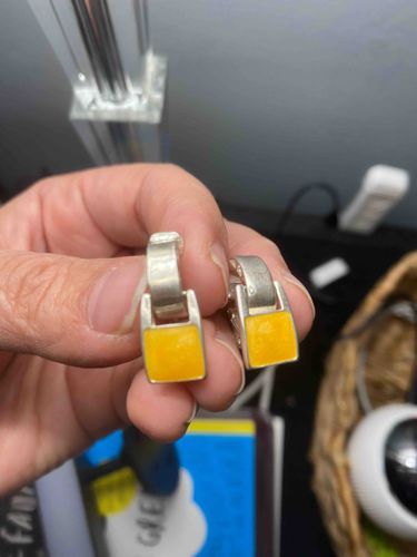 Modernist Silver and Yellow Stone Inlay Hoop Earrings