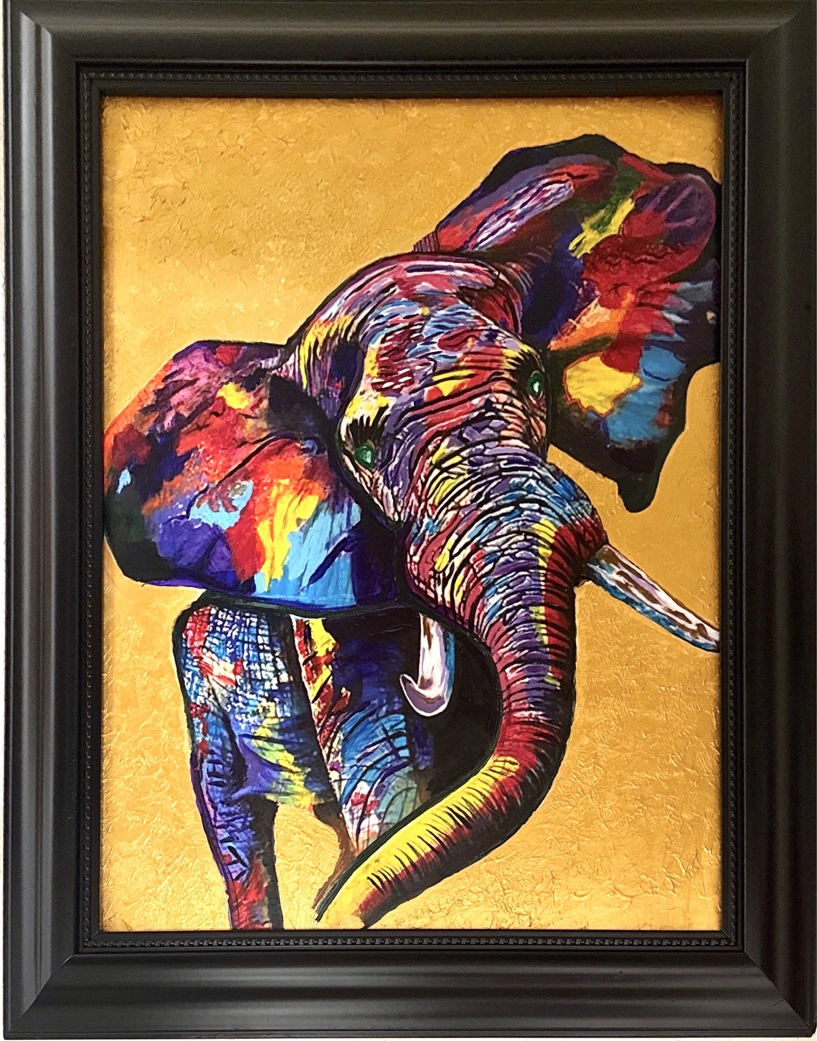 This contemporary artwork features a stylistically rendered African elephant, characterized by a vibrant, polychromatic palette. The elephant's form is composed of energetic strokes of red, blue, purple, yellow, and green, creating a prismatic effect that deviates from realistic color schemas. These colors are application with a visible impasto or heavy-body technique, particularly on the trunk and forehead, adding a tactile dimension typical of modern expressionist styles. The subject is set against a textured, metallic gold background that appears to be gold leaf or a high-quality metallic pigment, providing a shimmering contrast to the matte and satin finishes of the paint. The elephant's eyes are a striking vibrant green, and the tusks are rendered with subtle white and blue highlights. The canvas is housed in a classic, heavy-profile black frame with a dark mahogany-tone finish, featuring a beveled edge and an ornate inner bead detail known as 'pearl' or 'beading' moulding. The condition appears to be excellent, with no visible craquelure, paint loss, or warping to the substrate. The frame shows no noticeable chips or separations at the mitered corners. While there is no visible signature on the lower face, the craftsmanship indicates a skilled professional hand, likely from the late 20th to early 21st century.