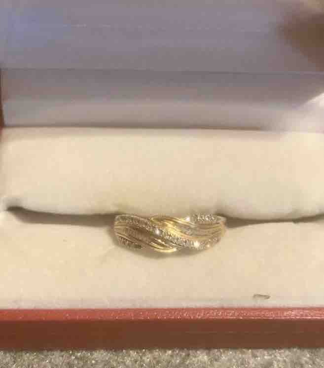 This item is a decorative band ring featuring a dynamic, sweeping multi-row swirl design. The construction appears to be a two-tone metal composition, likely 10k or 14k yellow and white gold, though hallmarks are not visible in the current view. The piece is set with multiple small, round brilliant-cut diamonds or diamond stimulants, arranged in recessed channels. The design consists of overlapping polished yellow gold bands intertwined with white gold bands that are pavé-set with melee-sized gemstones. The overall width of the band tapers toward the back, while the front presents a broad, textured appearance typical of late 20th-century or early 21st-century modern jewelry styles. Regarding condition, the metal surfaces show a soft luster with no immediately visible deep gouges or missing stones, though light surface scratches and minor patina consistent with gentle wear are expected. The craftsmanship displays a complex interlocking metalwork technique that provides significant light play between the polished gold and the faceted stones. The item is presented in a classic red and white hardshell jewelry presentation box with a silk or satin lining.