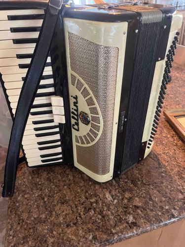 This is a vintage mid-century piano accordion manufactured by Cellini, a brand historically associated with quality Italian craftsmanship during the accordion's golden era. The instrument features a striking two-tone aesthetic with ivory-colored celluloid panels contrasted against black trim and a dark pleated bellows section. The treble side consists of a standard piano-style keyboard with white and black keys, showing mild yellowing consistent with age. Centrally positioned are three white register switches (treble couplers) which allow the player to change the reed settings and tonal quality. The front grille is ornate, featuring a metallic mesh behind a decorative sunburst-style cutout, proudly displaying the 'Cellini' cursive logo and a small decorative crest. On the opposite side, a full bank of black bass buttons is visible, typical of a professional or intermediate-level instrument. The bellows appear to be in good structural condition with reinforced metal corners, though they show signs of dust accumulation in the folds. Attached is a heavy-duty black leather shoulder strap. Notable condition issues include minor surface scuffing on the celluloid, slight oxidation on some metal hardware, and general wear from use. This specimen likely dates from the 1940s to 1950s and represents the sturdy, reliable build quality of Italian-made reeds from that period.