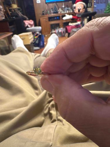 This item is a classic solitaire ring featuring a single, round-cut gemstone held by a traditional six-prong setting. The central gemstone appears to be a peridot, characterized by its distinctive olive-to-lime green hue and moderate brilliance. The stone is estimated to be approximately 0.50 to 0.75 carats in size. The band is a slender, polished high-carat yellow gold shank with a rounded profile, tapering slightly as it approaches the basket. The construction reflects a timeless, minimalist style typical of late 20th-century to contemporary jewelry design. Upon close inspection, the metal shows minor surface scratches and a light patina consistent with moderate wear, but the shank remains thick and structural integrity appears sound. There are no readily visible maker's marks or hallmarks in this view, though they would typically be located on the interior of the band. The prongs appear well-seated against the crown of the gemstone, suggesting good craftsmanship. The overall presentation is that of a delicate, elegant piece of fine jewelry suitable for use as a birthstone ring or a modest anniversary gift. Evaluation of the stone's clarity and precise metal purity would require physical testing with a jeweler's loupe and acid test or XRF analysis.