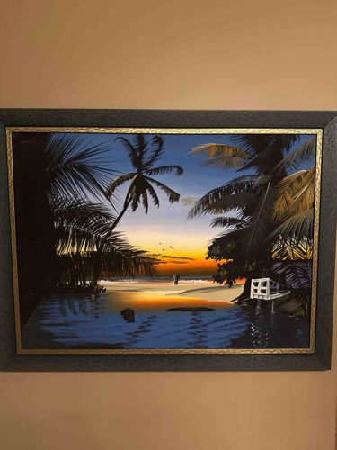 This is a rectangular horizontal landscape painting executed in a realistic, illustrative style, likely oil or acrylic on canvas. The composition features a serene coastal scene at twilight, framed by lush tropical foliage. In the foreground, silhouettes of palm fronds and dense tropical trees create a natural dark boundary on the left and right sides. The center reveals a sandy beach meeting a calm body of water, which reflects the vibrant orange and yellow glow of the sun setting on the horizon. A deep blue sky fades into soft peach and gold tones near the waterline. Small details include silhouettes of birds in flight and what appears to be a small white structure or boat on the right bank. The painting is housed in a contemporary double-frame system: an inner beaded gold-tone wood fillet or frame, and a larger, dark espresso-colored outer frame with a textured finish. The artwork exhibits high contrast and smooth blending in the sky and water. The condition appears to be excellent with no visible craquelure, fading, or physical damage to the canvas or frame assembly. The style suggests a late 20th to early 21st-century production, often associated with commercial decorative art or regional souvenir fine art. No visible artist signature is discernible in this view, though it may be located in the lower corners obscured by the frame shadow.