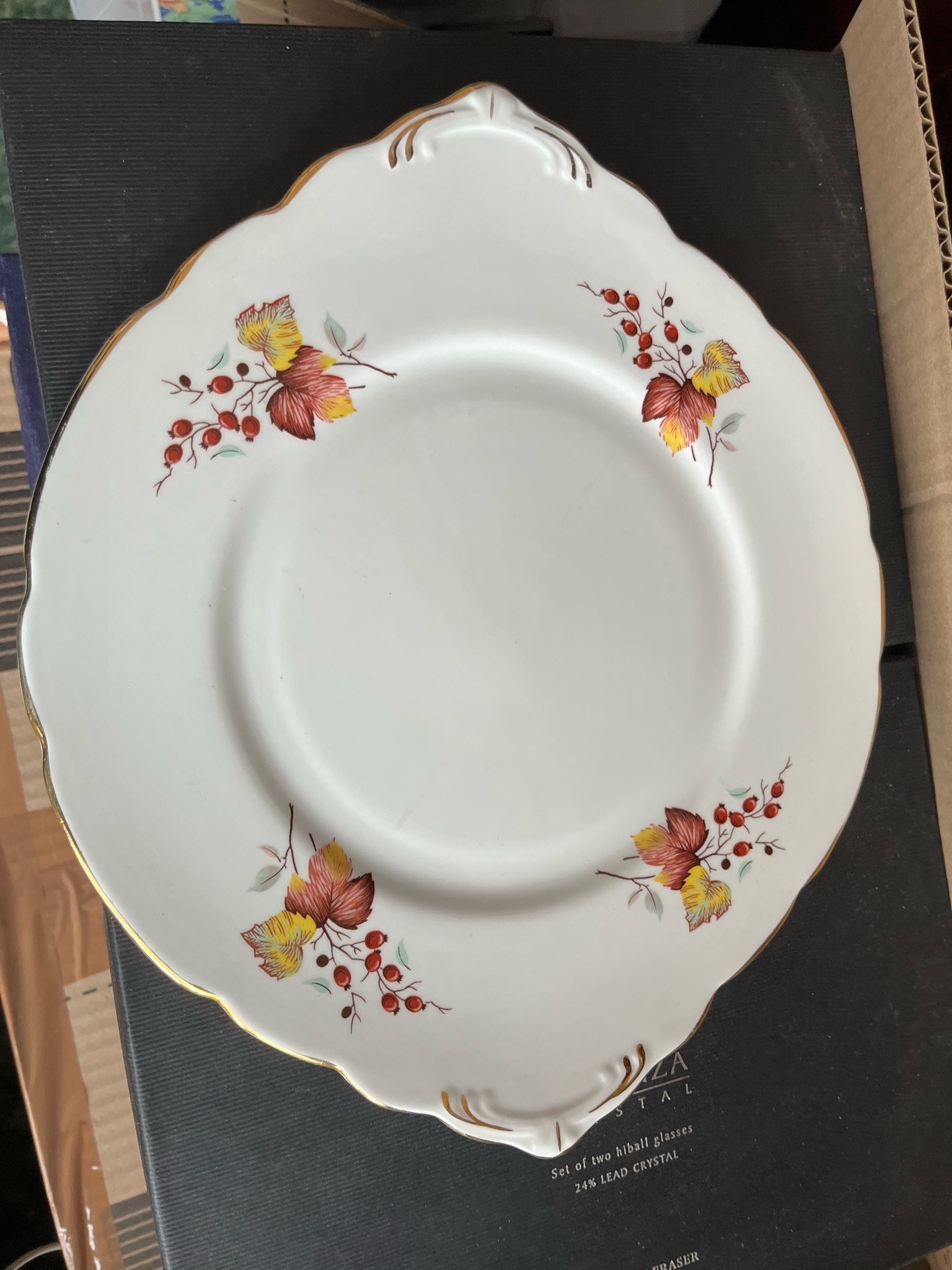 This is a vintage fine bone china serving plate produced by Gladstone China in Staffordshire, England, likely dating from the mid-20th century (c. 1950s-1960s). The plate features a distinct scalloped, lobed edge with two decorative tab-style handles integrated into the rim, embellished with subtle gold gilt relief. The body is a crisp white porcelain decorated with four asymmetrical transfers of autumn foliage and red berries. The botanical motif incorporates leaves in shades of russet brown and golden yellow with delicate cross-hatched detailing, accompanied by sprigs of red berries and pale mint green leaves. The entire circumference of the plate is finished with a fine gold gilt rim. The craftsmanship reflects the classic Staffordshire bone china tradition, exhibiting a high-glaze finish and translucent quality when held to light. Regarding condition, the plate appears well-preserved with no visible chips or cracks. There is very minor thinning of the gold gilt on the raised handle portions consistent with light handling, and the center well shows minimal surface scratching from stacking or utensil use. The transfer patterns remain vibrant with no significant fading.