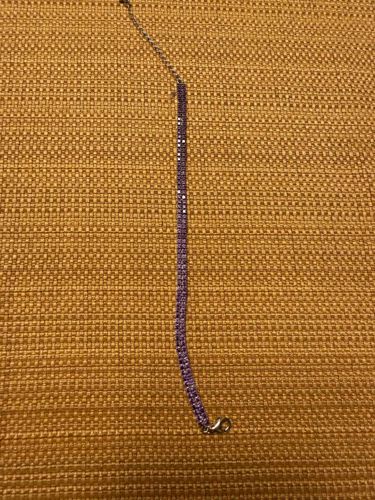 This item is a fashion-style tennis bracelet featuring three parallel rows of light purple or lavender rhinestones. The bracelet is constructed with individual square-cut synthetic stones, likely glass or crystal, set in a silver-toned metal mounting. Based on its appearance, the metal is likely an alloy or plated base metal rather than high-carat precious metal. The piece measures approximately 6 to 7 inches in length, featuring a lobster claw clasp mechanism at one end and a thin silver-toned extension chain at the other, allowing for adjustable sizing. The construction is a flexible line style, where individual square settings are linked to create a fluid motion on the wrist. Regarding condition, the metal shows some minor signs of surface oxidation or dulling consistent with frequent wear and contact with skin oils. There are no immediately visible missing stones in the image provided, though slight misalignment in the rows indicates a mass-market manufacturing quality rather than fine jewelry standards. The style is contemporary, likely dating from the 1990s to the current modern era. The item lacks any visible hallmarks or maker's marks in the photo, suggesting it is a costume jewelry piece intended for casual or dress wear. Overall, it serves as an example of common 20th/21st-century decorative accessory craftsmanship.