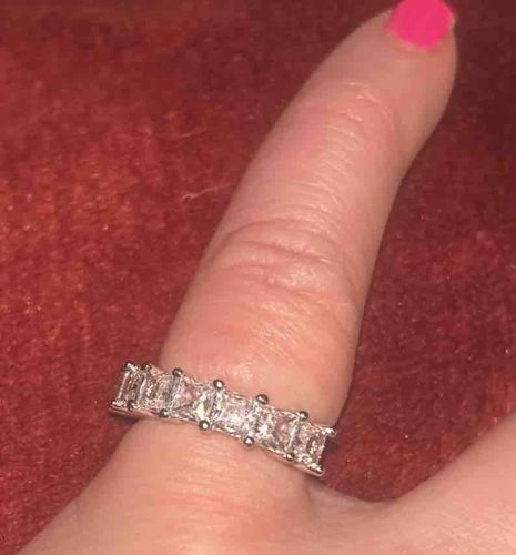This item is a contemporary-style ring featured on a wearer's finger, characterized by a continuous row of princess-cut (square) colorless gemstones. The stones appear to be approximately 3mm to 4mm square each, exhibiting a high brilliance and white color, suggesting they are either diamonds or high-quality cubic zirconia. The metal setting is white in tone, likely white gold, platinum, or sterling silver, and utilizes a shared-prong construction where small metal beads secure the corners of adjacent stones. This specific setting style maximizes light entry into the stones but leaves the girdle edges somewhat exposed. Visible in the image are at least six stones, indicating it is likely a half-eternity or full-eternity band design. The craftsmanship shows uniform spacing and alignment of the facets, indicative of machine-assisted or high-quality hand-setting. There are no obvious maker's marks or hallmarks visible from the top-down perspective, but the overall presentation is that of modern bridal or fine fashion jewelry, likely manufactured within the last 10 to 20 years. The condition appears excellent with no visible missing stones, loose settings, or significant metal scratching, although actual stone quality (clarity and color grade) would require magnification to confirm.