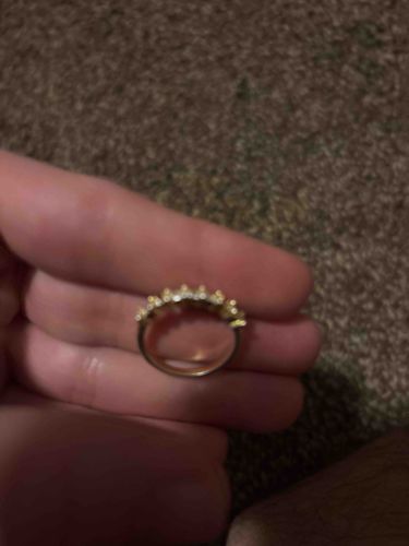 This is a jewelry item consisting of a band ring, held between two fingers against a textured background. The ring appears to be a half-eternity style band, featuring a series of small, clear, round-cut stones—likely diamonds, cz, or crystals—set across the upper arc of the shank. The metal has a yellow gold-colored finish, suggesting it is either solid yellow gold (likely 10k or 14k) or gold-plated base metal. The construction features a prong or pavé setting to secure the multiple stones in place. Physically, the shank appears relatively thin and tapers towards the bottom. Regarding condition, the metal shows signs of general wear with minor surface scratches and a dulling of the original luster, common in pre-owned jewelry. There are no immediately visible cracks or missing stones from this angle, though the low lighting makes a definitive assessment of stone clarity difficult. The style is classic and contemporary, making it difficult to date precisely, though it reflects modern jewelry manufacturing techniques from the late 20th or early 21st century. No maker's marks or hallmarks are visible in this specific photograph, which are often located on the interior of the band.