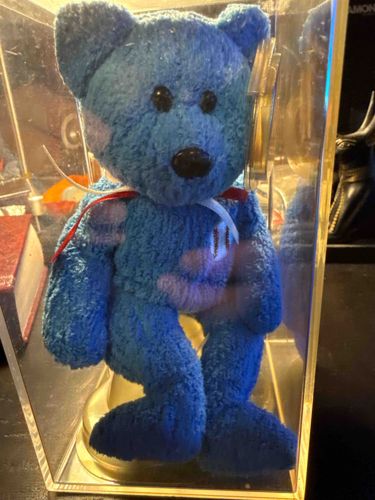 This item is a 1999 Ty Beanie Baby known as 'Clubby II', a limited-edition bear released exclusively through the BBOC (Beanie Babies Official Club). The bear is approximately 8.5 inches tall and is constructed from a vibrant royal blue 'terry' or textured fabric, which differs from the standard smooth plush used on primary Beanie line items. It features coal-black plastic bead eyes and a matching black plastic nose. A distinctive red, white, and blue patterned ribbon is tied around its neck in a simple bow. On its left chest, there is an embroidered silver and white emblem representing the Beanie Babies Official Club. The bear retains its original heart-shaped 'swing tag,' which is protected by a clear plastic 'tag protector' sleeve, indicating collector-conscious storage. The item is displayed inside a custom-sized clear acrylic hard case with a gold-toned circular base, which has helped preserve the fabric's color and texture. The condition appears to be 'Mint,' with no signs of fading, frayed stitching, or stains visible. These bears were manufactured by Ty Inc. in China and represent the peak era of the late-1990s plush toy collecting craze.