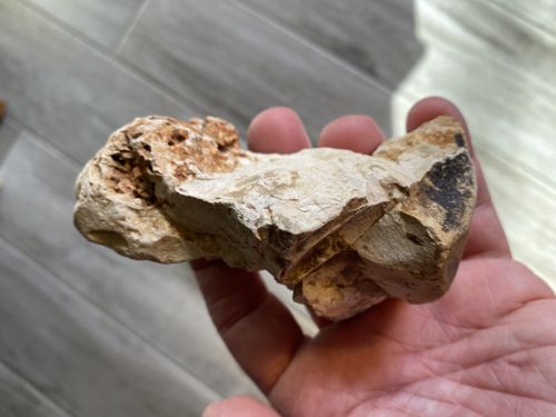 This artifact is a lithic biface tool, identified as a hand axe or scraper, measuring approximately 4 inches in length and 3 inches in width. It is constructed from a light-colored, tan-to-cream chert with visible inclusions of iron-rich reddish-brown oxidation, characteristic of stones found in the Guthrie, Oklahoma region. The tool exhibits bifacial flaking, where material has been removed from both sides to create a functional edge. The surface displays a significant amount of cortical surface and rugged texture, indicating a fairly rustic manufacture or a tool in the early-to-mid stages of reduction. Notably, the item features several hinge fractures and step fractures along its worked margins. The condition is heavily weathered with a significant calcareous patina and accumulated mineral deposits (caliche) within the crevices, suggesting long-term burial in an alkaline soil environment. While the user identifies this as Mousterian (typically associated with Neanderthals in Eurasia), in a North American context, such a tool would typically be classified within the Middle Paleoindian or Early Archaic lithic traditions. The craftsmanship is utilitarian, prioritizing function over aesthetic symmetry, with a thick cross-section that would have provided durability for heavy-duty scraping or chopping tasks. There are no modern maker's marks, as it is a prehistoric lithic artifact.