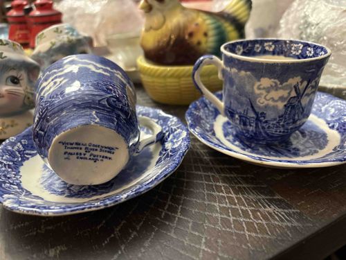 This is a vintage English transferware tea set produced by Palissy Pottery, featuring the 'Thames River Scenes' pattern in a classic cobalt blue and white aesthetic. The set shown includes two teacups and coordinating scalloped saucers. One cup is upturned to reveal a clear maker's mark on the base, which reads: 'VIEW NEAR GREENWICH' THAMES RIVER SCENES BY PALISSY POTTERY ENGLAND. The transferware design depicts a continuous landscape scene featuring windmills, sailing vessels, and clouds, rendered with fine stippling and cross-hatching typical of mid-20th-century British earthenware. The saucers feature a matching floral border with a central river scene. The pieces are constructed from glazed ceramic earthenware. Condition appears moderately worn; there is visible discoloration and darkening (crazing/staining) on the interior of the upright cup and significant wear along the scalloped edges of the saucers, indicating frequent use. Palissy Pottery was a trade name used by A.E. Jones (Longton) Ltd, later becoming part of the Royal Worcester group. This specific 'Thames River Scenes' series is a nostalgic mid-century interpretation of 19th-century scenic patterns, likely dating from the 1950s or 1960s. The craftsmanship reflects mass-produced English pottery of the era, intended for everyday decorative use rather than fine porcelain status.