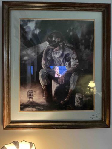 This is a large, professionally framed and matted print depicting a mature coal miner in a moment of quiet reflection. The subject is shown with a full grey beard, wearing traditional work gear including a hard hat with a cap lamp casting a beam of light, and rugged heavy-duty boots. To his right sits a Davy-style flame safety lamp, which provides a secondary warm light source within the composition. The artwork utilizes a dramatic chiaroscuro-inspired style, with high-contrast lighting and a muted, earthy color palette consisting of charcoal greys, deep blacks, and sepia tones. The print is housed under glass within a gold-accented white mat and a substantial dark-grained wood frame, likely finished in a walnut or oak stain. A signature and possibly an edition number are visible in the lower right-hand corner of the print, though they are difficult to read through the glass. The piece appears to be in good vintage condition; the frame shows light surface dusting but remains structurally sound with no deep gouges or significant nicks visible. The print itself shows no signs of foxing or water damage, though the glass currently exhibits reflections from the surrounding room lighting. The quality and somber tone of the piece suggest a late 20th-century production, likely created as a commemorative or artistic tribute to the industrial heritage of mining communities.