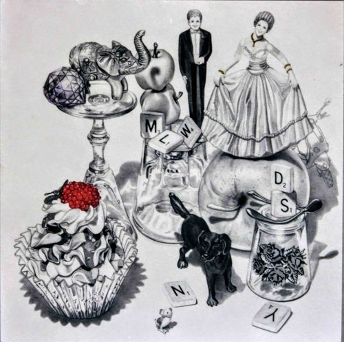 This artwork is a complex monochromatic watercolor and ink composition on canvas, measuring approximately 3044 x 3023 units. The piece utilizes a high-contrast grayscale palette with strategic, vibrant red accents found in the topping of a prominently featured cupcake. The composition is a surrealist assembly of disparate objects, including a decorative elephant figurine perched atop a glass pedestal, paper-doll-like figures of a man in a tuxedo and a woman in a formal gown, glass jars, Scrabble tiles (letters M, L, W, D, S, N, Y), and several apples. A small black dog figurine stands centrally, adding a sense of narrative life to the static objects. The objects are rendered with meticulous cross-hatching and shading, suggesting a high level of technical skill in light and reflection, particularly evident in the glassware and the metallic sheen of the elephant. The condition appears stable with no visible tearing or foxing, maintaining crisp edges on the figural cutouts. The style is contemporary, drawing influence from pop art and surrealism through the scale distortion of everyday objects (like the giant apples) versus the human figures. There are no visible maker's marks or signatures, suggesting an anonymous contemporary origin. The quality is marked by the artist's ability to layer transparent textures, such as the glass jars, over solid objects while maintaining structural perspective.