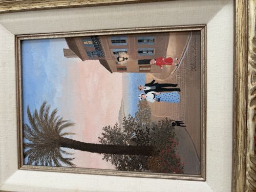 This is an original painting, likely oil or acrylic on canvas, executed in a 'Naïve' or Folk Art style. The scene depicts an idyllic European or coastal landscape, featuring figures in early 20th-century attire walking along a cobblestone path. Notable characters include a woman in a blue polka-dot skirt and a man in a formal dark suit. The composition is framed by a tall palm tree and lush greenery in the foreground, with a multi-story building and a soft, pastel-colored sunset sky in the background. The artwork is signed 'Fabienne Delacroix' in the upper right-hand corner. Delacroix is a recognized contemporary French artist known for her Belle Époque-inspired scenes, dating this piece likely to the late 20th or early 21st century. The painting is housed in a sophisticated multiple-profile frame, consisting of an inner champagne-silver beaded border, followed by a wide cream-colored fabric linen liner, and an outer ornate gilded or silvered wood frame with floral carvings. The condition appears excellent with no visible craquelure or paint loss; the frame shows minor age-related patina but remains structurally sound. The craftsmanship is high, indicative of a professional gallery piece with attention to texture in the cobblestones and delicate foliage detailing.