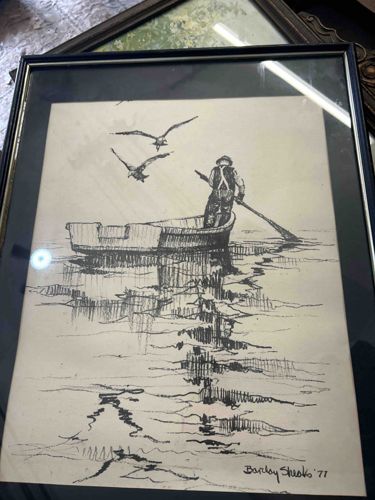 This is a framed pen and ink drawing on paper depicting a solitary fisherman standing in a dory, rowing or poling through calm waters, accompanied by two seagulls in flight. The artwork is signed 'Barclay Sheaks '77' in the lower right corner, identifying it as a work by the noted American artist Barclay Sheaks (1922-2010), known for his coastal Virginia and Chesapeake Bay subjects. The composition is rendered in a minimalist, illustrative style using black ink on off-white or cream-toned paper. The use of hatching and cross-hatching creates reflections on the water's surface, while the white space of the paper effectively represents the atmosphere and light. The work is housed in a simple black frame with a silver-toned inner lip, protected by glass. Regarding condition, there is visible mottling and foxing appearing in the upper left quadrant of the paper, suggesting exposure to moisture or high humidity over time. The paper shows slight yellowing consistent with age. The frame appears to be a basic modern commercial frame with minor scuffs. Barclay Sheaks was a prominent Virginia artist, and while his acrylics are highly sought after, his ink drawings showcase his strong draughtsmanship and understanding of maritime life. The 1977 date places this in his mature period of production.