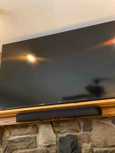 This item is a large-format flat-panel LED television, identified by a visible 'TCL' logo centered at the bottom bezel. The screen size appears to be approximately 55 to 65 inches diagonally, featuring a slim-bezel 'frameless' design common in modern sets produced within the last 3-5 years. The television displays a glossy black finish with a reflective screen surface, which currently shows reflections of a ceiling light and a ceiling fan from the room environment. Mounted directly beneath the television is a professional black soundbar, likely an Atmos-enabled or surround-sound unit, supported by two discreet wall brackets. The soundbar features a soft-textured acoustic fabric or fine metallic mesh grille with rounded edges. Visible wiring is noted hanging from the center of the soundbar, indicating a standard residential installation over a wooden mantelpiece and a faux-stone or natural stone architectural hearth. The physical condition appears excellent with no visible cracks, dead pixels (while powered off), or surface abrasions, though some typical handling dust and light reflections are present. The craftsmanship reflects mass-market consumer electronics quality for the contemporary digital era.