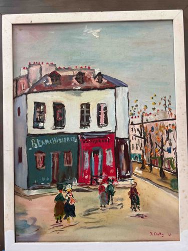 This item is an original oil painting on board or canvas, depicting a bustling Parisian street scene in a Naïve or Fauvist style. The composition features a central white building with a green storefront labeled 'BLANCHISSERIE' (laundry) and a red storefront labeled 'RESTAURANT.' Small, stylized figures in colorful attire occupy the foreground, while a row of trees and another building recede into the distance on the right. The color palette is vibrant, using bold reds, deep greens, and stark whites against a muted sky. The brushwork is expressive and impasto-heavy, particularly in the trees and architectural details. A signature is visible in the lower right corner, appearing to read 'A. Crosby' followed by a date, possibly '61'. The artwork is housed in a simple, narrow white wooden frame that shows some signs of age-related wear, including minor scuffing and discoloration. The painting itself shows some yellowing of the varnish and minor surface grime consistent with a mid-20th-century piece. There are also some small white spots on the right side of the frame and potentially on the edge of the artwork that may indicate paint splashes or mold spots, which would require professional cleaning. Overall, the piece demonstrates a charming, mid-century decorative aesthetic typical of post-war souvenir or gallery-style European landscapes.