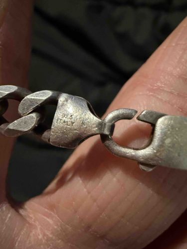This item is a heavy curb (Grumetta) link chain crafted in sterling silver. The piece features flat, interlocking circular links that have been faceted to create a smooth, reflective surface. The end connector is stamped with the numerical hallmark '925', indicating a metal purity of 92.5% silver, and the word 'ITALY', denoting its country of origin, which is well-regarded for high-quality machine-made jewelry. The chain is equipped with a lobster claw clasp mechanism, which provides a secure closure suitable for its substantial weight. In terms of condition, the silver displays a noticeable dull grey patina and surface oxidation, typical of age and frequent wear. There are visible micro-scratches and minor abrasions across the flat faces of the links, though no structural deformation or significant metal fatigue is apparent in the links shown. The construction is solid and mass-produced, characteristic of late 20th-century or contemporary Italian silver manufacturing. The scale appears suitable for a men's bracelet or a heavy necklace, suggesting a durable and versatile jewelry piece produced with industrial precision.