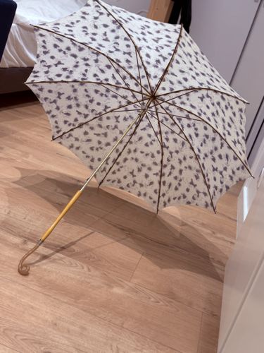 This item is a vintage-style parasol or umbrella featuring a classic long-shaft design. The canopy is constructed from a lightweight fabric, likely a polyester or nylon blend, displaying a neutral off-white or cream base color. It is decorated with an all-over abstract floral or 'leopard-like' motif in dark grey or muted purple tones. The structure consists of approximately sixteen thin metal ribs, which provide a rounded, multi-panel dome shape when fully deployed. The ribs are finished in a bronze or brass-toned coating, suggesting a mid-to-late 20th-century manufacture. The central shaft appears to be made of metal with a faux-wood or light-colored wooden finish, terminating in a distinctively carved shepherd's crook or 'J-shaped' handle. The handle shows a scrolled end detail, indicating attention to aesthetic craftsmanship. Regarding condition, the fabric appears taut without visible punctures or significant staining, though typical minor creasing is present from storage. The mechanical runners and joints show a light patina consistent with age but seem functional. The overall style is reminiscent of late mid-century fashion accessories, blending utility with a decorative, feminine aesthetic suitable for sun protection or as a theatrical prop.