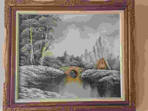 This item is an original oil or acrylic painting on canvas, depicting a serene landscape featuring a stone bridge, a small cottage, and a body of water set against a backdrop of distant mountains. The color palette is largely tonal, dominated by shades of grey, white, and black, with strategic pops of green and orange-brown to highlight foliage and the bridge's structure. The work is executed in an impressionist style with visible, textured brushstrokes, suggesting a mid-to-late 20th-century origin. The artwork is housed in a substantial, ornate wooden frame with a gilded or antiqued gold finish, featuring carved floral and scrolling motifs at the corners and along the midpoints. The frame includes a recessed purple-toned liner and a thin white inner fillet, adding depth to the presentation. Construction appears sturdy, though the frame shows some minor surface wear and patina consistent with age. There are no immediately visible artists' signatures in this low-resolution view, but the technique indicates a practiced hand familiar with classic European landscape composition. The sky is rendered with soft, hazy blending, providing a dramatic contrast to the more impasto applications used for the foreground rocks and the reflected water surface.