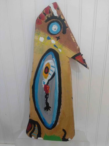 This is an original, untitled vertical mixed-media artwork by an unidentified artist. The piece is executed on an irregularly shaped, weathered wooden substrate, likely a reclaimed cedar shingle or roofing scrap, which features a pointed apex and a distinctive triangular projection on the right side. The composition is highly abstract and figurative, depicting a stylized bird-like or totemic figure. Dominant colors include ochre, cerulean blue, and black, with accents of red and yellow. The upper portion features a large, wide-eyed gaze with a bright blue iris outlined in heavy black paint. The center of the piece displays a blue-rimmed portal or aperture containing a smaller, gestural figure. The painting demonstrates a raw, 'Outsider Art' or folk-art aesthetic, utilizing thick impasto-like application and bold, primitive lines. The wood grain remains visible under thin washes of tan paint in several areas. Condition-wise, the edges appear intentionally rough and weathered, consistent with found-object art. There is some minor chipping and paint loss along the tapered edges and the 'beak' projection. No discernible signature or date is visible on the front face. The craftsmanship is characterized by expressive, unrefined energy rather than classical technical precision, likely dating from the late 20th to early 21st century.