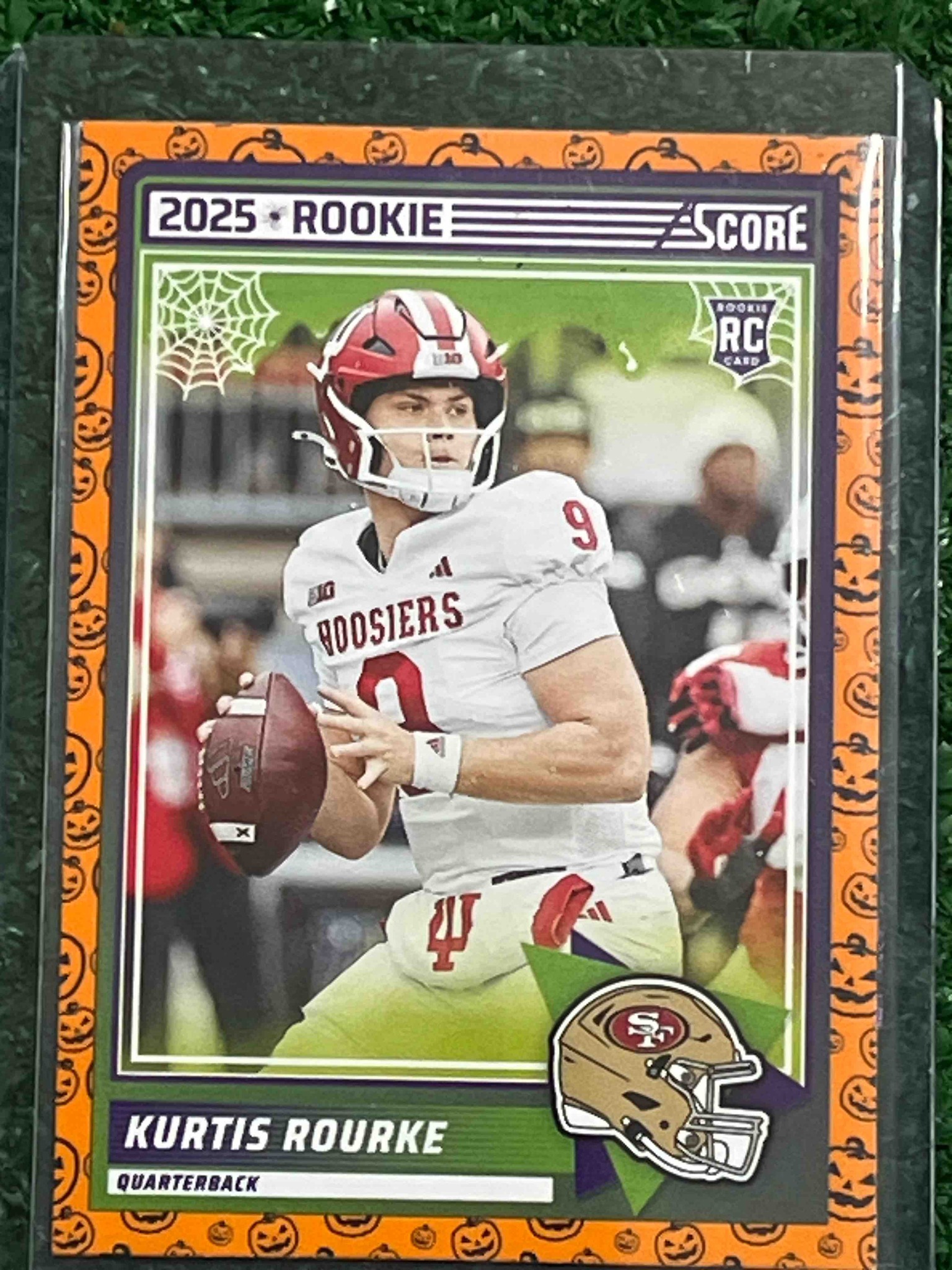 This is a 2025 Score Football trading card featuring Kurtis Rourke, quarterback for the Indiana Hoosiers, in his collegiate uniform. The card is a specialized seasonal 'Pumpkin' parallel, notable for its vibrant orange border decorated with repeating jack-o'-lantern illustrations. The center image depicts Rourke in a passing stance, wearing a white Indiana jersey and a red helmet. Notable design elements include a '2025 Rookie' banner at the top, a stylized spider web in the upper left corner, and an 'RC' (Rookie Card) shield in the upper right. A San Francisco 49ers helmet logo is featured in the bottom right corner, indicating his professional affiliation. The card appears to be in Excellent-Mint condition, housed in a protective plastic sleeve and top loader. There are no visible creases or heavy corner wear, though minor surface scuffs on the plastic holder are present. The printing utilizes high-gloss cardstock with sharp color saturation, typical of modern Panini-Score production standards. The reverse side, though not visible, would contain player statistics and biographical information.
