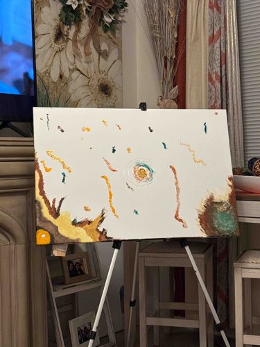 This item is an original abstract mixed media painting on a medium-format horizontal canvas, resting on a white tripod easel. The composition is characterized by a minimalist white background which serves as a stark stage for spontaneous, gestural applications of color. The palette is comprised of earth tones, including mustard yellow, ochre, burnt sienna, and dark umber, contrasted with accents of teal and dark turquoise. A central focal point features a circular swirl of paint, while the corners and various points across the surface display organic, splatter-like forms and ribbon-like strokes. There appears to be tactile texture suggesting the use of thick impasto or potential additive materials like sand or gel to give the pigments physical dimension. The painting is unframed with the paint extending to the visible edges, indicative of contemporary gallery-wrap or studio-style finish. The condition appears excellent with no visible signs of cracking, yellowing, or structural trauma to the canvas. Given the context provided, this work is attributed to the creative partnership of Willis-McCorkle, whose style often explores cosmic and natural themes through fluid abstraction. The craftsmanship reflects a modern, expressive approach where negative space is as significant as the applied medium.