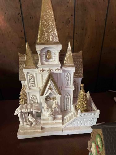 Vintage Gold and White Illuminated Musical Cathedral with Nativity Scene