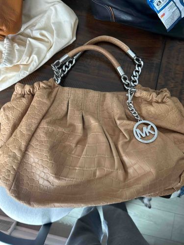 This is an authentic Michael Kors shoulder bag crafted from tan or camel-colored leather with a prominent crocodile-embossed texture. The bag features a voluminous, slouchy silhouette with vertical pleating on the front and rear panels, creating a 'hobo' or framed satchel aesthetic. The top edge is gathered, leading to dual rolled leather handles integrated into chunky silver-toned metal chains. A distinguishing feature is the large, iconic silver-toned circular 'MK' logo charm suspended from the exterior chain. The hardware shows high polish with some light surface micro-scratching. The leather appears to be in good pre-owned condition, though there is visible softening of the structure and minor darkening or patina consistent with use on the handle grips. The embossed pattern is deep and clear, providing a luxury aesthetic characteristic of Michael Kors designs from the 2010s era. The craftsmanship is evident in the uniform stitching and the robust weight of the metal hardware components. Overall, the item shows moderate signs of light wear but maintains its functional integrity and stylistic appeal.