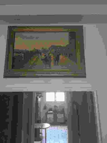 This item is a large-format landscape painting housed in a substantial, ornate gilded frame. The artwork appears to be an oil or acrylic on canvas, depicting a rural scene with multiple figures, possibly laborers or travelers, moving through a field or along a path. The palette is dominated by earthy tones including ochre, deep greens, and browns, suggestively captured in the light of late afternoon or early evening. The style is reminiscent of late 19th-century or early 20th-century European Impressionism, characterized by visible brushstrokes and a focus on the play of light. The frame is a standout feature, displaying a thick profile with several tiers of molding and a possible gold-leaf or gilt-paint finish that shows a weathered patina consistent with age. There are no immediately visible maker's marks or signatures due to the image resolution, but the scale and framing suggest a work intended for a formal residential setting. The condition appears stable, though there is some unevenness in the surface illumination which might indicate a need for professional cleaning to remove aged varnish. The craftsmanship of the frame implies a high-quality production, typical of the late Victorian or Edwardian periods.