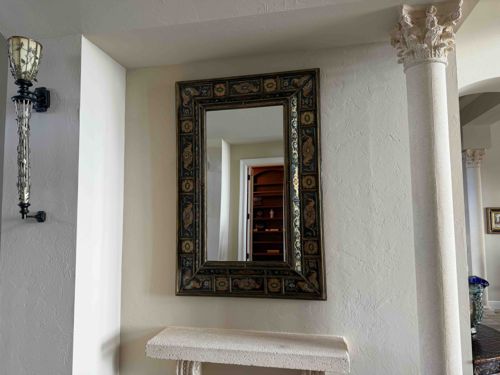 This is a rectangular wall mirror featuring a wide, ornate frame in the traditional Peruvian 'Cajita' or Andean style. The primary physical characteristic is the use of the reverse painted glass technique (verre églomisé), where intricate floral and foliate motifs are hand-painted on the back of glass panels before being set into the frame. The color palette is rich and earthy, consisting of deep blacks, burnout ambers, and antiqued gold leaf accents within the decorative borders. The frame construction appears to be wood, supporting a central rectangular mirror with beveled edges and an inner layer of mirrored strips. Notable features include the rhythmic alternating patterns of medallions and scrollwork across the four quadrants of the frame. The condition appears well-maintained with a natural aged patina on the gilded sections; no significant cracks or chipping to the delicate glass panels are visible from the image. This style often reflects mid-20th century to contemporary craftsmanship from the Cusco region of Peru. The quality is indicated by the precision of the hand-painted symmetry and the complexity of the multi-layered frame design, which blends colonial Spanish influence with indigenous artisan techniques.