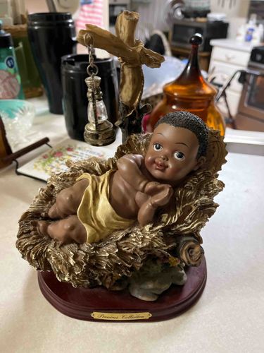 This decorative figurine portrays an African American infant, representing the Christ child, reclining in a textured manger bed of straw. The piece is constructed from cast resin, meticulously hand-painted with realistic skin tones, dark textured hair, and a mustard-yellow loincloth. Behind the infant stands a stylized wooden cross made of bark-like resin, featuring a small metallic lantern hanging from a chain. The entire scene rests on a dark mahogany-finished oval wooden base. A gold-tone metal plaque on the front of the base is inscribed with the stylized text 'Precious Collection'. The figurine measures approximately 6 to 8 inches in height. Noteworthy details include the expressive facial features with large, glossy eyes and a slight smile, reflecting late 20th-century decorative styling typical of collectibles from companies like Home Interiors or similar giftware brands. The condition appears well-maintained with no visible chips or cracks, though light dust accumulation is present in the crevices of the straw and cross. The craftsmanship demonstrates high-volume commercial production quality with attention to textural contrast between the smooth skin and rough hay.