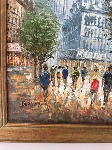 This is an original oil painting on canvas depicting a bustling Parisian street scene, signed 'BURNETT' in the lower left corner. The artwork is executed in a mid-20th-century Impressionist style, characterized by heavy impasto and swift, palette knife applications that create a textured, three-dimensional surface. The palette consists of earthy browns, greys, and muted blues, punctuated by vibrant pops of red and yellow in the figures' clothing and storefronts. The composition features a perspective view of a boulevard populated with stylized pedestrian figures and tall European-style architecture. Physically, the painting is housed in a classic distressed wood frame with a gilt finish that shows some light age-related wear and minor scuffing. Historically, while the name 'Caroline Burnett' is associated with many such works produced for the souvenir and export market from the late 19th through mid-20th centuries, this specific piece displays the rhythmic brushwork typical of the 1960s-1970s era. The canvas appears taut, with some light surface dust and a natural aged patina across the paint layer, but no visible cracks, flakes, or previous restoration efforts are discernible in this view. The craftsmanship displays a confident, rapid execution designed to capture the atmosphere and light of a rainy or overcast day in the city.