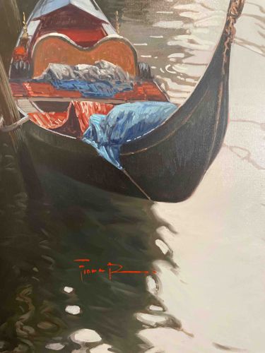 This is a contemporary impressionist-style oil painting featuring a close-up perspective of a traditional Venetian gondola. The composition focuses on the aft section of the boat, showcasing rich interior details including plush orange-red upholstery, ornate gold-toned scrollwork on the seat back, and a vibrant blue textile draped over the gunwale. The vessel's black hull displays fluid, confident brushstrokes, reflecting the play of light and shadow on its polished surface. The background and water are rendered with a bright, high-key palette consisting of off-whites, neutral greys, and olive greens to represent the iconic Venetian canal reflections. The painting is executed on a textured canvas, which is visible through the thinner applications of paint, adding a tactile dimension to the work. In the lower center, the artist's signature, appearing as 'Fiona P.', is prominently applied in a bright red-orange pigment, contrasting sharply with the dark reflections. The condition appears excellent with no visible signs of cracking, yellowing of the varnish, or mechanical damage. This piece likely dates toward the late 20th or early 21st century and exhibits professional craftsmanship with a focus on color harmony and light dynamics typical of modern decorative fine art inspired by travel landscapes.