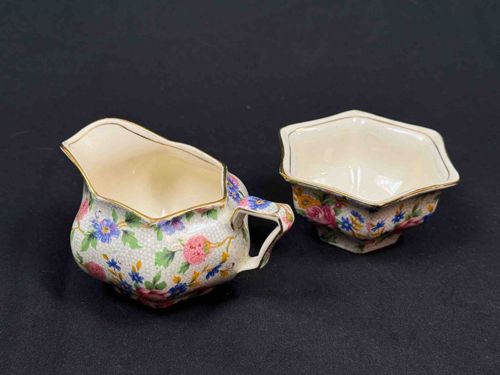 This is a two-piece porcelain set consisting of a small milk pitcher (creamer) and an open sugar bowl, specifically in the iconic 'Summertime' chintz pattern by Royal Winton Grimwades. The pieces feature a distinctive six-sided, hexagonal fluted shape with an elegant cream-colored interior. The exterior is densely decorated with a vibrant floral chintz motif, showcasing a variegated bouquet of pink roses, yellow marigolds, and blue speedwell blossoms set against a fine, light-colored honeycomb or dots transfer-printed background. The rims and the angular, squared handle are accented with delicate hand-painted gold gilding, showcasing the high-quality craftsmanship of early 20th-century English ceramics. Based on the pattern and form, this set likely dates to the Art Deco period, approximately the 1930s to 1940s. The condition appears sound with no visible chips or cracks from this angle; however, consistent with its age, there appears to be some fine crazing in the clear overglaze and minor shelf wear on the hexagonal footed bases. The gilding remains mostly intact but shows slight thinning on the high-use edges of the spout and handle. This set represents a quintessential example of English chintzware, highly sought after by collectors for its dense floral coverage and graceful geometry.