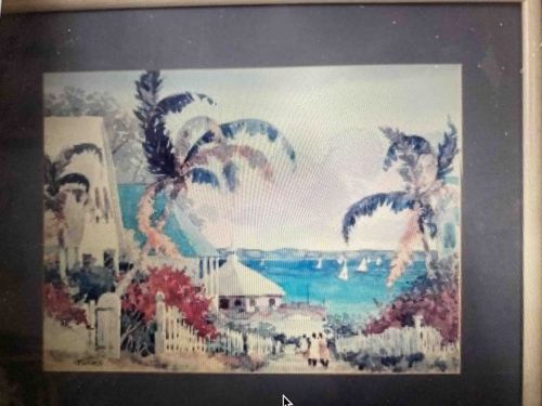 This item is an original watercolor painting on paper titled 'Harbor Walk' by the American artist William Ternes (1930-2014). The composition depicts a lush, tropical coastal scene looking past white picket fences and colonial-style architecture toward a bright blue harbor dotted with white sailboats. The foreground is anchored by vibrant red bougainvillea and tall, swaying palm trees rendered with loose, expressive brushwork. Three figures are seen strolling away from the viewer down a central path, adding a sense of scale and life to the idyllic setting. The color palette is dominated by cool blues and greens contrasted with warm botanical reds and the stark white of the buildings under a pale, atmospheric sky. The artwork is housed in a dark blue mat within a simple, light-toned frame. Ternes was known for his mastery of the watercolor medium, particularly his ability to capture light and shadow in maritime and coastal landscapes. A signature is visible in the lower left corner. The condition appears stable within the frame, though there is a noticeable circular glare on the protective glass in the central upper region of the image. The style is typical of mid-to-late 20th-century American impressionistic watercolor, characterized by fluid washes and a spontaneous execution that emphasizes the play of coastal light.