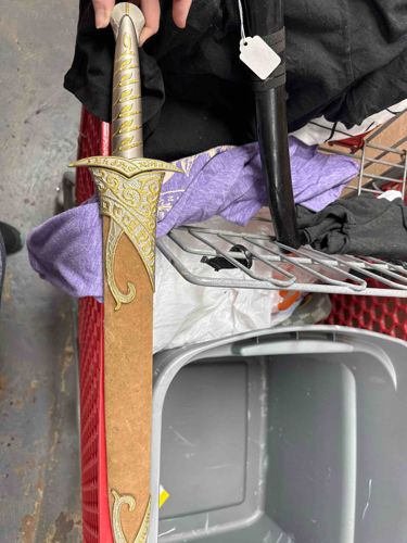 This item is a detailed cinematic replica of 'Sting,' the magical short sword (Elven dagger) famously wielded by Bilbo and Frodo Baggins in The Lord of the Rings film trilogy. The hilt features a cast metal construction with a matte silver finish, accented by a spiral vine motif in gold-tone paint. The crossguard is distinctively downward-curving and inscribed with Sindarin Tengwar characters, a signature design element from the films. The blade, partially visible at the throat, is likely factory-sharpened stainless steel. The accompanying scabbard is wrapped in a textured, tan-colored leatherette or genuine leather material, featuring ornate metal fittings at the throat and chape. These fittings are cast with deep, Elven-style scrollwork and filigree in a matching antique gold-tone finish. Based on the construction and design, this is likely an officially licensed product manufactured by United Cutlery or a high-quality reproduction of that specific model. The condition appears fair to good; there are visible signs of dust, minor surface tarnish on the metallic accents, and some light wear on the scabbard wrap. It lacks its original wall plaque or certificate of authenticity in the image, which are standard for high-end collectibles. The item likely dates from the early 2000s to the 2010s.