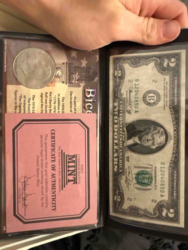 This is a United States Bicentennial commemorative currency set produced and marketed by the First Commemorative Mint. The set features two primary components of legal tender: an Eisenhower Dollar coin (likely the 1776-1976 copper-nickel clad dual-dated variety) featuring the profile of Dwight D. Eisenhower, and a 1976 Series Two Dollar federal reserve note. The note displays the portrait of Thomas Jefferson on the obverse and is a Series 1976 bill from the Second Federal Reserve District (New York, denoted by the 'B' seal). The serial number visible is B12040850A. Both items are housed in a black vinyl folder with clear protective sleeves. Included is a pink Certificate of Authenticity (COA) from the First Commemorative Mint, which guarantees the items as genuine legal tender struck by the United States Mint. The set also includes decorative cardstock backing with historic imagery of Liberty Bell and descriptive text. The condition of the currency appears to be uncirculated or lightly handled, though the note shows minor waves common for plastic storage. The folder and paperwork show crisp edges with no significant fading or tearing, suggesting the item has been well-preserved in a collection.