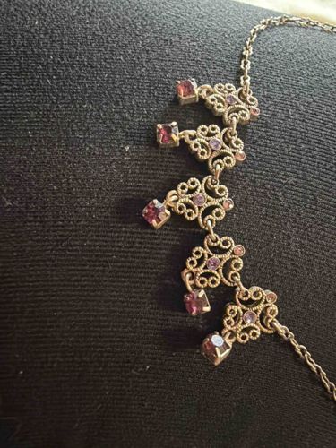 This is a vintage-style decorative necklace featuring intricate gold-toned metalwork. The piece consists of five graduated openwork filigree stations, each designed with elegant scrollwork patterns reminiscent of the Belle Époque or Victorian revival periods. From each filigree station hangs a single, square-set faceted amethyst-colored rhinestone or glass stone, creating a rhythmic 'droplet' effect across the wearer's neckline. Each filigree section itself is accented with small, round-cut lavender stones at its center and edges, providing a subtle color variation from the darker purple of the square drops. The metal appears to be a plated base metal with an antiqued brass or gold finish, showing some slight darkening and patina consistent with age. The chain is a standard cable link style. In terms of condition, the stones appear to be intact and securely prong-set, though some minor surface wear and dullness on the faceted glass are visible upon close inspection. There are no immediate signs of repairs, such as inconsistent soldering, suggesting it is in its original state. This jewelry piece likely dates to the mid-20th century (1950s-1970s) or is a high-quality modern revival, exhibiting fine attention to detail in the ornate casting of the metal components.