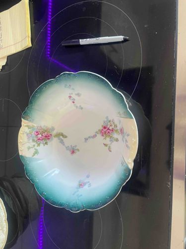 This is a vintage fine porcelain serving bowl featuring a heavily scalloped and molded rim. The bowl displays a deep teal or 'flow blue' style gradient wash around the perimeter, which transitions into a cream-colored center. It is decorated with delicate floral transfers consisting of pink roses and small blue accent flowers arranged in asymmetrical clusters. The construction suggests a medium-weight earthenware or ironstone based on the thickness of the rim. Notable features include subtle relief molding or embossing along the outer edges, providing a tactile texture. While no maker's mark is visible from the top view, the style is reminiscent of late 19th-century to early 20th-century Victorian or Edwardian tableware, likely of European (English or German) origin. The condition appears fair to good; there is some noticeable fading in the transfer decals and potentially some light surface scratching or glaze wear consistent with age and domestic use. The color gradient shows a rich, saturated hue that is characteristic of high-quality chromatic glazing from the turn of the century. There are no immediate signs of large cracks or deep chips visible in the photograph, though the underside would need inspection for a full condition report.