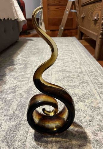This is a hand-blown art glass sculpture featuring a dynamic, organic flame or 'S-curve' silhouette. The piece is crafted using the 'sommerso' technique, characterized by layers of solid glass. The color palette transitions from a deep, smoky charcoal or dark amber tone at the thickened circular base to a lighter, honey-amber transparency in the slender, undulating upper neck. The construction shows a high level of craftsmanship, with a fluid, seamless curve and a fire-polished finish that gives it a lustrous, reflective surface. The sculpture rests on a flattened, polished base for stability. In terms of condition, the glass appears clear without visible interior clouding, though there may be minor shelf wear on the bottom resting surface, which is common for vintage pieces. While no maker's mark is immediately visible in the image, the style and execution are strongly reminiscent of mid-20th-century Murano glass from Italy or Scandinavian art glass from makers like Holmegaard. Its aesthetic aligns with the 1960s or 1970s Modernist movement, emphasizing movement and minimalist form. The piece serves as a striking decorative object, showcasing the interplay between light and varying thicknesses of colored glass.