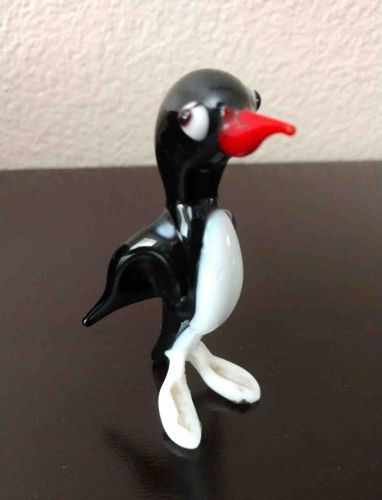 This is a small, handcrafted glass figurine of a stylized penguin, likely created using a lampworking or flame-working technique. The figurine stands approximately 2 to 3 inches tall and is constructed from opaque and semi-opaque glass rods. The primary body is rendered in high-gloss jet black glass, featuring an elongated neck and integrated tail. A contrasting white glass panel is fused to the front to represent the bird's belly, and the feet are formed from flattened white glass loops. The head features applied 'googly' eyes—white glass spheres with dark pupils—and a distinctive, tapered bright red beak that provides a sharp pop of color. The style is whimsical and cartoonish, reminiscent of mid-to-late 20th-century glass trinkets often produced in regions like Murano, Italy, or by artisanal glass blowers at fairs and studios. The condition appears fair to good; there are no obvious large fractures, but the surface of the red beak shows some minor scuffing or matte residue, and the base of the feet shows slight signs of shelf wear. No visible maker's marks or signatures are present, which is common for small glass novelties of this type. The craftsmanship is expressive, utilizing the natural surface tension of molten glass to create smooth, rounded contours.