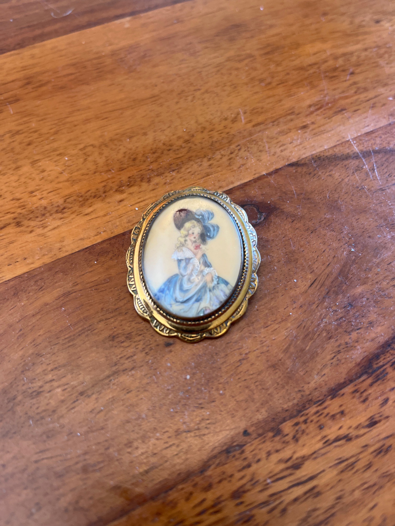 This is a small, oval-shaped decorative brooch featuring a central painted portrait of a Victorian or Rococo-style lady set within a metallic golden frame. The central miniature depicts a blonde woman in a voluminous blue and white gown, wearing an oversized dark hat with blue feather plumage, set against an off-white background. The frame is constructed with a scalloped, etched border and a granulated inner bezel that gives it a vintage aesthetic. The piece appears to be made of gold-plated or high-carat gold metal, holding either a hand-painted porcelain plaque or a fine enamel-on-metal miniature. The craftsmanship of the painting shows delicate brushwork in the folds of the dress and facial features. Regarding its condition, the metal frame displays a rich, darkened patina in the recessed areas, consistent with age. There is minor surface wear to the clear protective layer over the painting, but the colors remain vibrant with no significant chipping or crazing visible to the focal image. No maker's marks are visible from the front view, but the style suggests a mid-20th-century 'revival' piece or an authentic late-Victorian/Edwardian fashion accessory. The scalloped edges are well-defined, indicating a higher quality stamping or casting process.