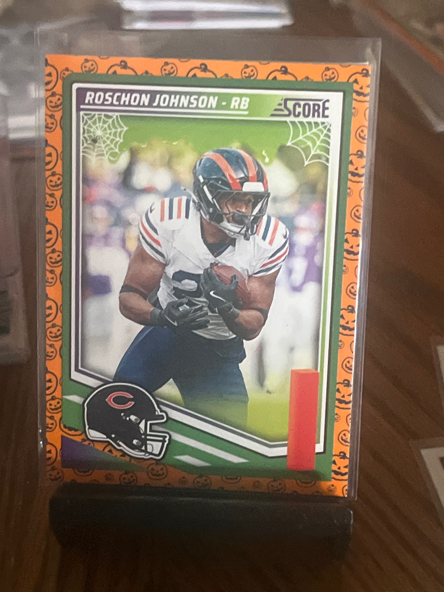 This is a 2.5" x 3.5" rectangular standard-sized trading card featuring Roschon Johnson, a running back for the Chicago Bears. The card is a limited-edition 'Halloween' parallel from the 2023 Panini Score football set. It features a distinctive orange border decorated with a repeating pattern of black jack-o'-lantern pumpkins. The central image shows Johnson in his white Chicago Bears jersey carrying a football. Notable thematic graphics include white spiderwebs in the top corners of the inner photo frame. The top header displays the player name and position in white text against a purple-to-green gradient bar, alongside the classic 'Score' logo. A Chicago Bears helmet logo is positioned at the bottom left. The card appears to be in Excellent to Near-Mint condition, housed in a clear protective plastic penny sleeve. There are no visible creases or surface scratches on the front; the centering appears slightly weighted toward the bottom right. The cardstock is typical modern gloss-coated paperboard, and the printing quality is sharp with vibrant orange and green hues, characteristic of modern high-volume sports card production.