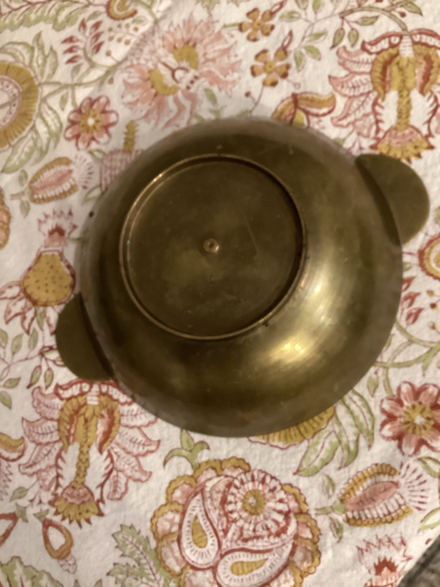 This item is a circular, low-profile bowl crafted from solid brass, potentially of mid-20th-century Asian or Indian origin. The bowl is shown inverted, revealing a recessed circular foot or base with a central indentation likely from the metal spinning or casting process. It features two symmetrical, semi-circular tab-style handles that project horizontally from the rim. The color is a muted, warm golden-yellow characteristic of aged brass. The construction appears to be machine-spun or cast metal with a medium gauge thickness. The surface exhibits a varied patina with substantial evidence of use and aging, including darkening (oxidation), spotting, and surface scratches. Notable condition issues include visible verdigris (greenish copper carbonate) near the handle junctions and around the base, and several small dings or pits consistent with age. There are no visible maker's marks or signatures on the base. The quality is indicative of mid-range decorative metalware, possibly intended as a serving dish, fruit bowl, or an offering vessel. The simple, geometric form suggests a utilitarian but elegant design that could be categorized under Mid-Century Modern or traditional folk-art brassware depending on the interior's details.